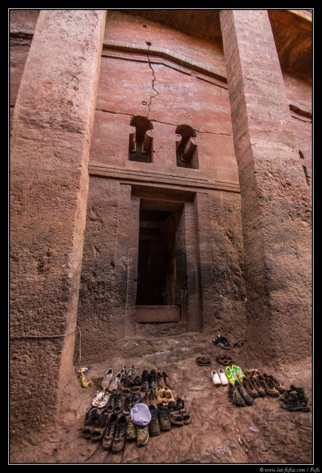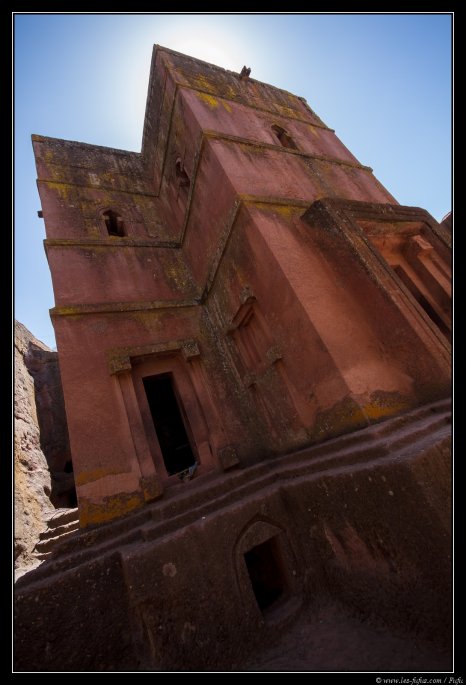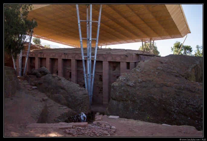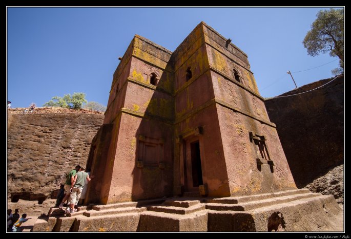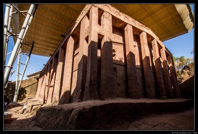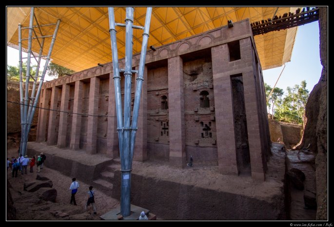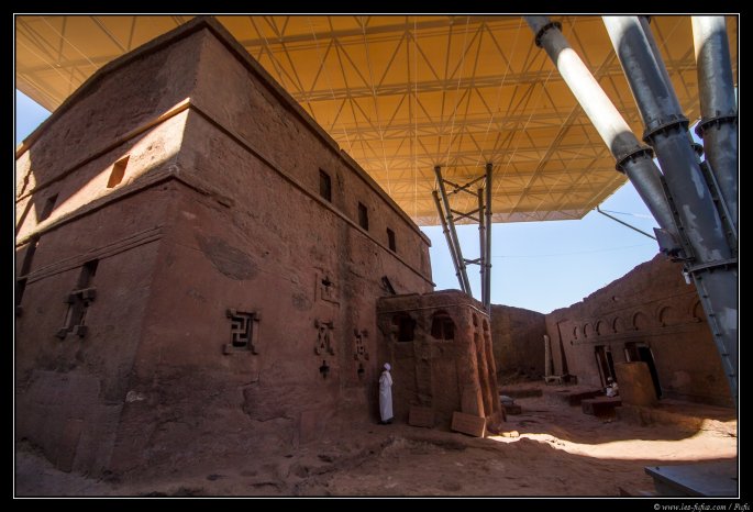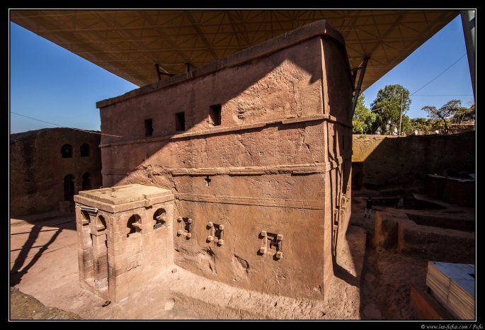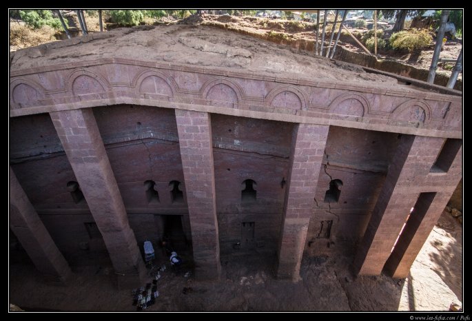 La toute première église à visiter est Bet Medhane Alem (lien Wikipédia). L’accès passe par une petite excavation dans la roche et qui rejoint les abords des murs de l’église. On fait le tour, et on ne peut s’empêcher de comparer cette construction à celles rencontrées à Pétra en Jordanie.