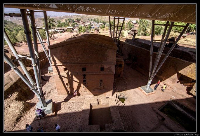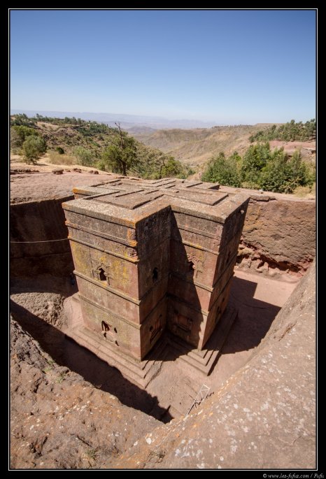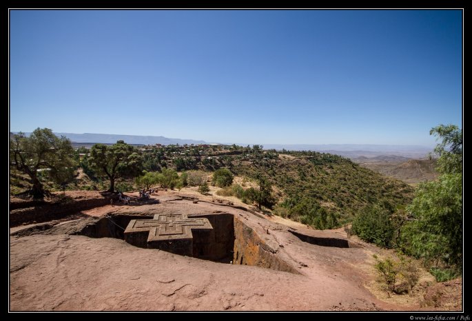 Fuad est à l’extérieur et nous indique la suite de la visite. C’est juste à coté, à 300m. C’est la partie Sud du site avec une seule église, mais aussi la plus célèbre, Bet Giyorgis ou Église Saint Georges (lien Wikipédia). On arrive par le dessus. Impressionnant avec le toit qui forme une croix et le paysage faisant face.