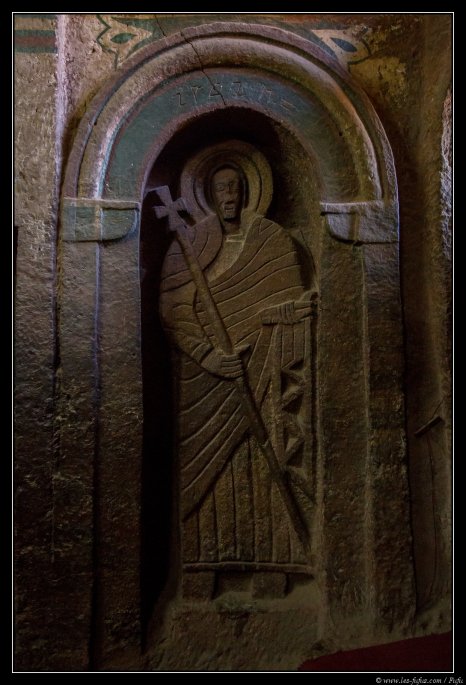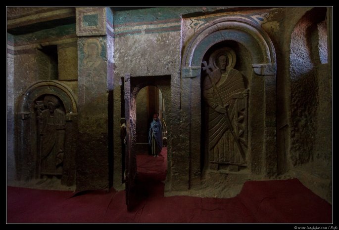 Il y a aussi une porte dans un mur permettant de rejoindre une deuxième église, souvent considéré comme faisant partie du même ensemble, Bet Mikael (lien Wikipédia). Sur les murs, on retrouve de nombreux bas-relief de toute beauté. A ne pas manquer lors d’une visite, même si cette partie est interdite aux femmes.
