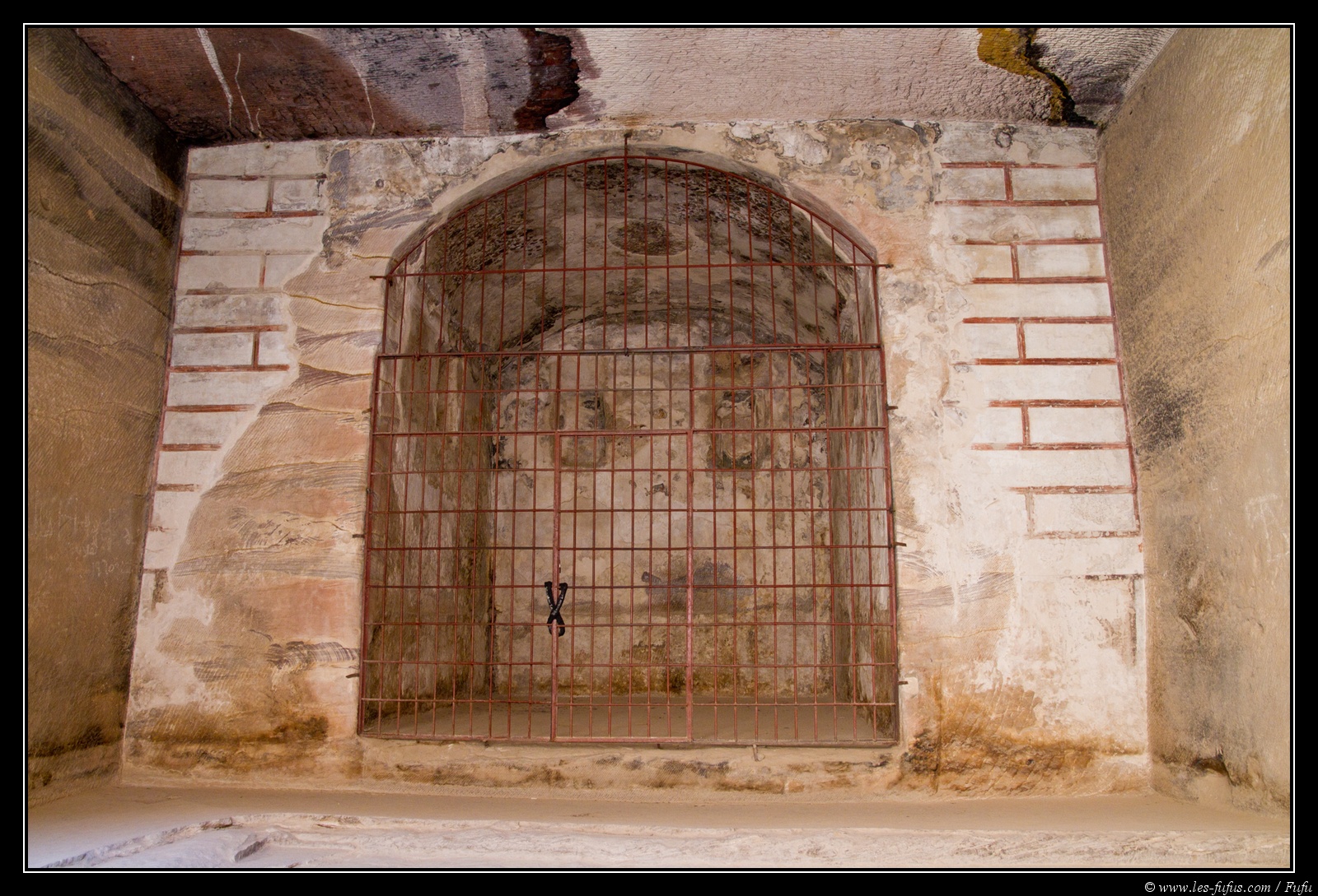 La pièce présente des peintures rouges sur les murs, et l’alcôve au fond est solidement protégée par des barreaux.
