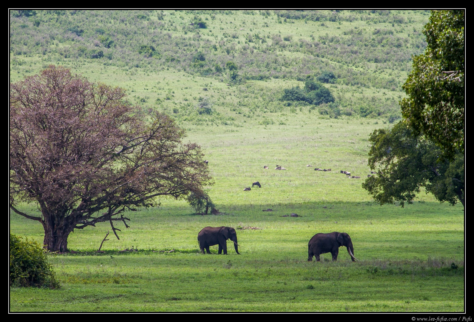 Et déjà, nous remarquons les troupeaux de gnous qui y paissent. Nous continuons la route afin de trouver l’une des entrées de la caldera.Sur le chemin, on croise des éléphants.