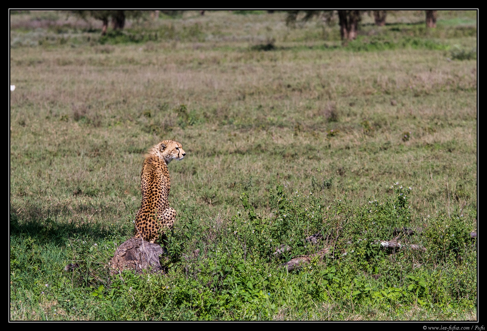 Et voici ce que nous avons vu pour la seule première journée : des gnous (vu qu’il y a en 1.6 million, ce n’est pas dur), des impalas, des élans, des zèbres, etc… Et aussi des éléphants, des vautours, des chacals, etc… Mais surtout, notre guide nous trouvera un magnifique guépard !!! Et proche qui plus est.