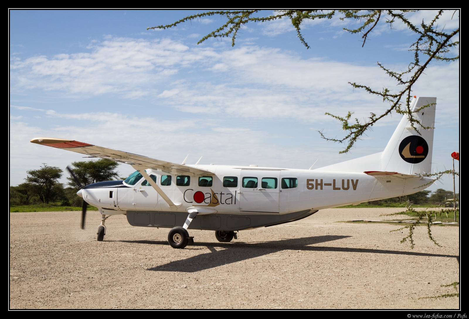Pour Aurélie, une nouvelle épreuve commence. Avant notre départ, elle avait peur de l’avion. Le vol intercontinental l’avait bien rassuré ….. mais maintenant, c’est autre chose !!!! Voici un vrai avion ! Douze places étriquées, du bruit partout, des trous d’air, une piste en terre où se balladent librement les girafes, elle n’en mène pas large
