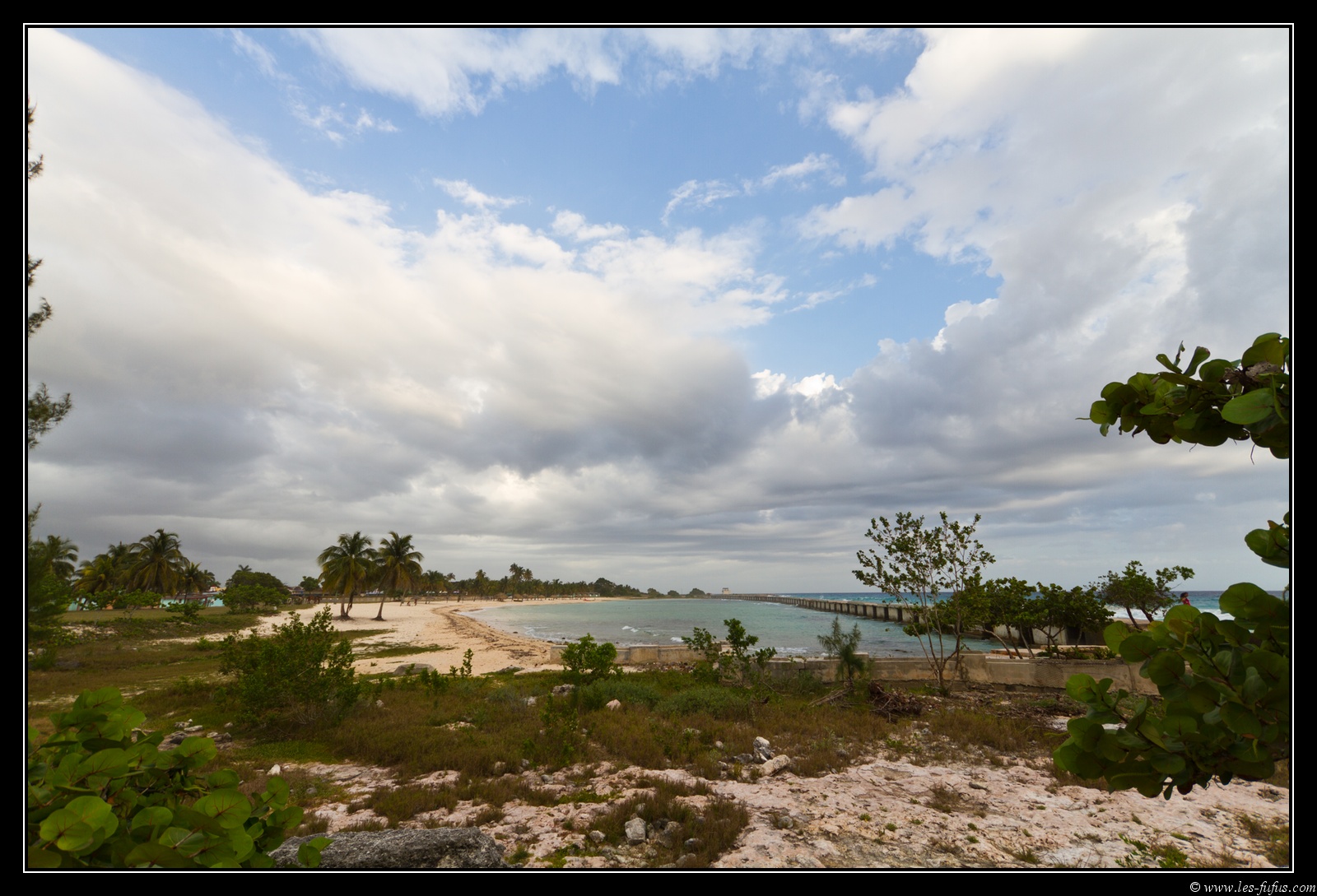 La plage est belle, mais pour la protéger des marées et des tempêtes, ils ont construit une énorme digue en béton du plus mauvais effet. C’est dommage.