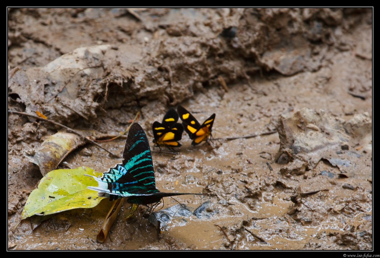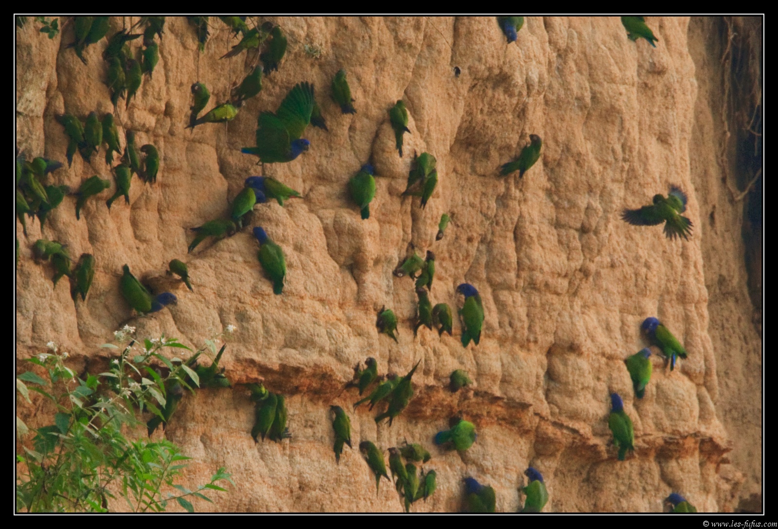 Nous pouvons alors admirer les perroquets qui viennent par groupe de 10-20 individus s’alimenter sur les parois. Le silence de la part des participants est requis pour ne pas effrayer les oiseaux ….. et je me suis chargé d’assurer ce silence : on n’entendra pas une seule fois les personnes qui nous accompagnent