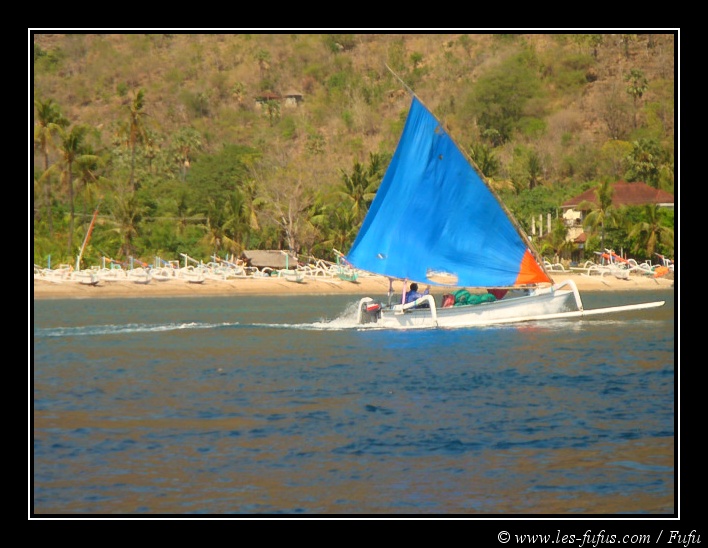 La première plongée se fait au niveau de la Japanese Wreck, à l’est d’Amed. Pour nous y rendre, on prend une petite pirogue à balancier. Pittoresque