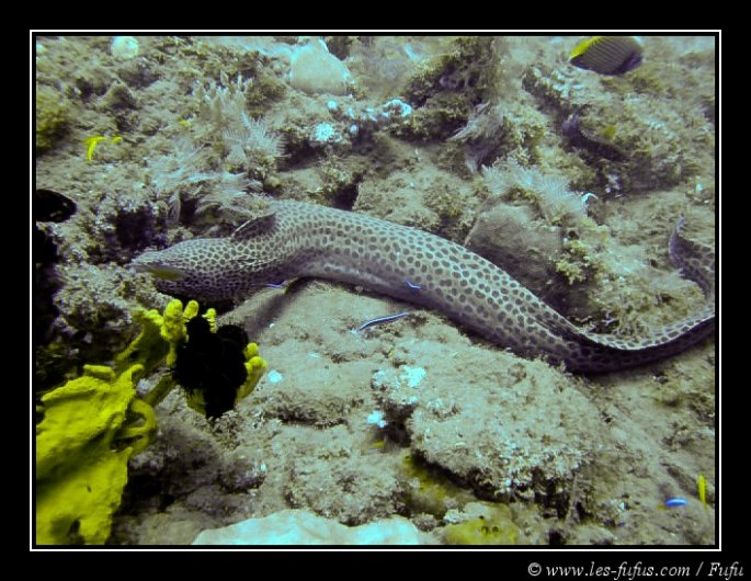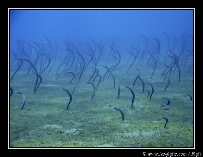 Durant cette plongée (22m maximum et 54 minutes), on passe par une grande étendue sablonneuse où des centaines d’anguilles chassent des proies. A notre passage, elles s’enfoncent dans le sable, pour n’en ressortir que derrière nous. C’est une sensation bizarre.
