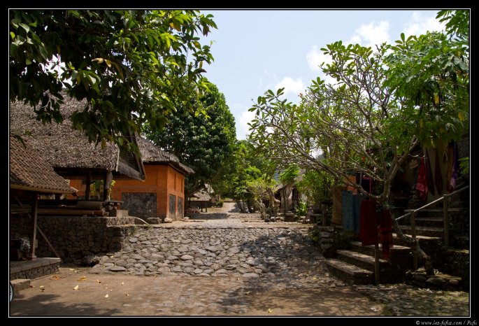 Notre guide nous emmène ensuite dans les montagnes et nous rejoignions le village de Tenganan (lien Wikipédia). Ce village est resté très traditionnel. Ainsi, seules les personnes issues du village ont le droit d’y résider, et encore faut-il ne se marier qu’avec une personne elle-même issue de la communauté. Il y a tout de même eu une ouverture sur l’extérieur et la prise en compte des touristes désireux de visiter ce village pittoresque : l’entrée du village est payante et les habitants fabriquent différent objets artisanaux de qualité, cela permettant de générer des revenus annexes pour la communauté. Le village est tout en longueur, les ruelles sont très propres. On trouve du bétail, et aussi de nombreuses cages à coq, élevé pour les combats.
