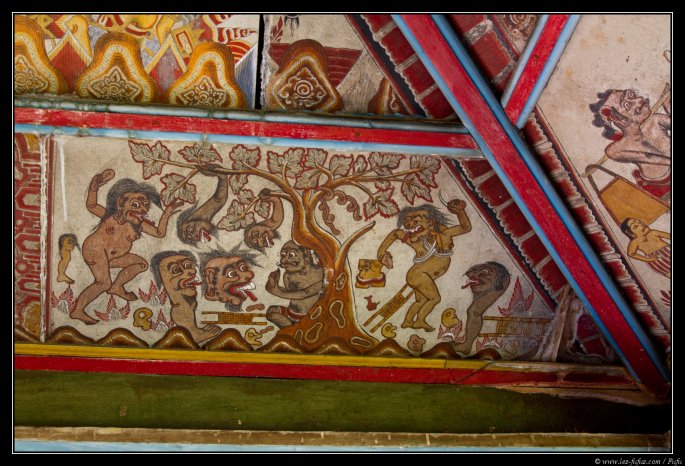 La journée se finit et notre guide part en direction de la ville d’Ubud. En chemin, nous passons par la ville de Klungkung et son célèbre palais (lien Wikipédia). Ce dernier a été construit au 17ième siècle. On y trouve notamment 2 pavillons, dont l’intérieur du toit est richement décoré. La visite vaut vraiment le coup et notre guide nous expliquera avec détail les histoires qui sont peintes au plafond.