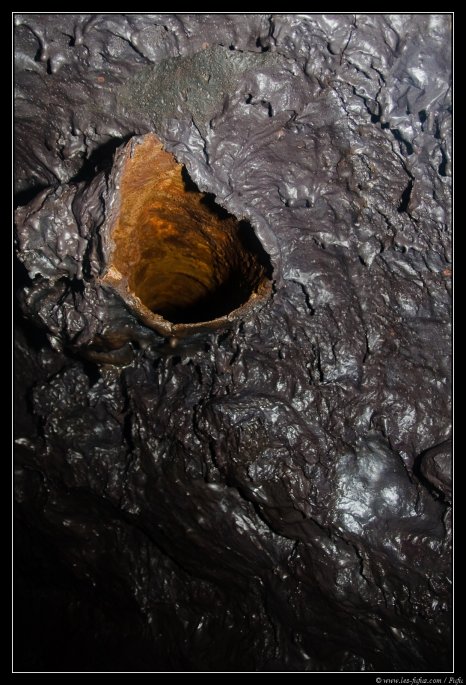 Un trou laissé par un arbre qui s’est consumé lentement pendant que la lave l’ensevelissait.