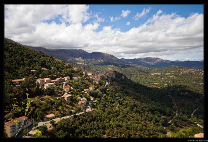 Nous reprenons la route et quelques kilomètres avant le village de Ponte Leccia, nous bifurquons sur une route secondaire qui nous emmène sur les hauteurs. Par moment le macadam est nickel, d’autrefois, ce n’est qu’un vaste champ de nid de poule. Une seule constante : la route n’est guère plus large qu’une piste cyclable et les bords donnent sur d’impressionnants précipices. Heureusement, la route est peu utilisée et on ne croisera quasiment aucune voiture. On passera par quelques villages typiquement corses, accrochés à flanc de montagne.