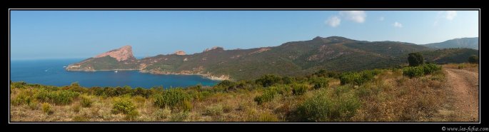 Nous poursuivons notre chemin et bifurquons à droite à Piana et nous dirigeons vers le Capo Rosso. J’ai préalablement repéré un petit chemin permettant une vue d’ensemble. Nous nous élancerons sur 1-2km sur un chemin en terre, le temps pour Sabine de voir que je commence à ne pas trop mal maitriser ma grosse bertha !