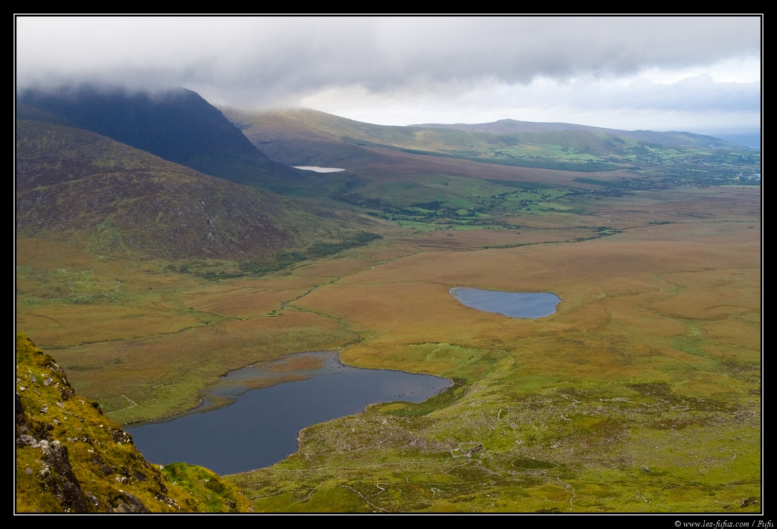 La vue de Connor Pass permet d'avoir un bref aperçu sur une parti de la péninsule, avec d'un coté, quelques petits lac, et de l'autre, une vue sur la petite ville de Dingle.