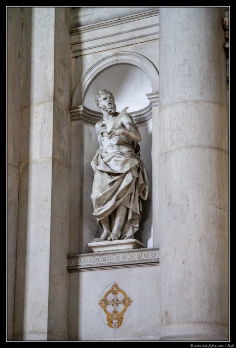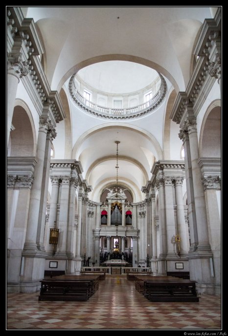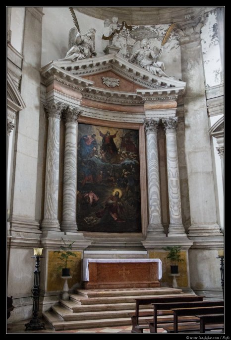 La journée commence et la pluie ne s’est malheureusement pas arrêtée. On prend le vaporetto pour traverser la lagune et rejoindre la petite ile où est construite l’église San Giorgio Maggiore. Ici, les touristes viennent rarement, ce qui permet de visiter quasiment seul l’édifice.