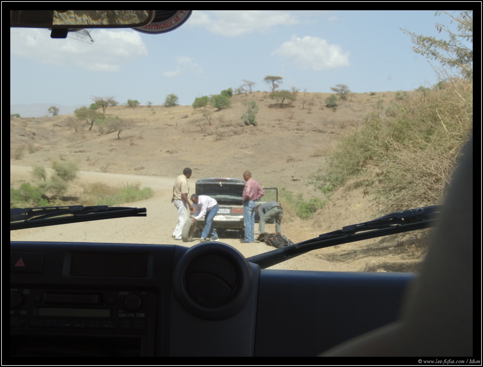 On reprend la route et quelques kilomètres plus loin, c’est l’occasion de notre deuxième BA de la journée : un véhicule est en panne sur le bord de la route et a besoin d’aide. Le conducteur a crevé 2 pneus (c’est con ça