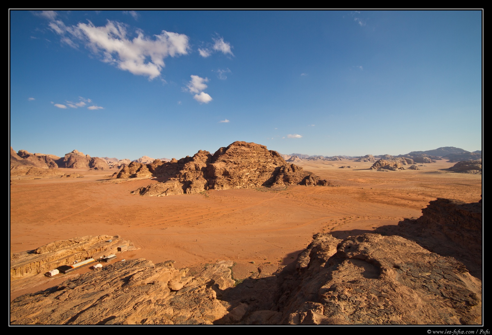 De ce point, j’ai une vue imprenable sur les environs. Certes le Wadi Rum n’est pas le plus beau désert que Sabine et moi avons eu la chance de visiter (y a vraiment trop de monde et il y a trop de trace de pneu), mais d’ici, on apprécie tout de même l’ambiance du site.
