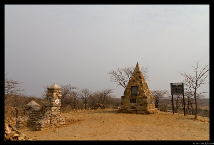 Là, on s’arrête à un mémorial dédié au Dorslandtrekker. Ce mémorial commémore les colons qui ont fuit l’Afrique du sud suite à l’annexion par l’Angleterre. Ceux-ci se sont implantés par la suite en Angola, puis sont partis à nouveau vers sud quand les portugais leurs ont interdit de parler leur langue et ont essayé de les convertir de protestants à catholiques.