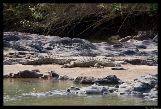 A ce sujet, un petit jeu: Sur cette photo se cache un croco. Saurez-vous le voir ? Leur camouflage est époustouflant. On avait du mal a les voir aux début malgré l'aide du personnel du camping.