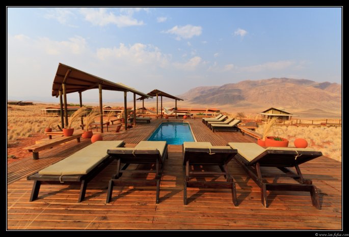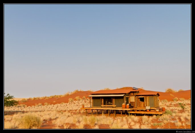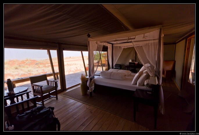 Le lodge est constitué de 10 bungalows privatifs d’une soixantaine de mètres carrés chacun, avec deux grandes terrasses à l’abri des regards. Ils sont construits sur une grande dune, faisant face à une montagne. Les murs sont en fait des toiles de tente doublée d’une moustiquaire. Il est possible « d’enrouler » tous les murs et de n’avoir que le toit pour seul abri.