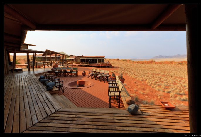 En plus des bungalows, une partie commune est construite. Elle est composée de nombreuses pièces et de très nombreuses terrasses. Globalement, on peut séparer le complexe en 3 parties : la piscine, le bar avec des salons, et la salle à manger. L’ensemble fait face à un point d’eau où de très nombreux oryx ont leurs habitudes. Ces dernièrs n’ont d’ailleurs pas peur et s’approchent des fois à 2-3 mètres des bungalows. La déco, elle, fait penser à un campement reculé de l’Afrique des années 20. Il y a beaucoup de détail. C’est très bien fait.