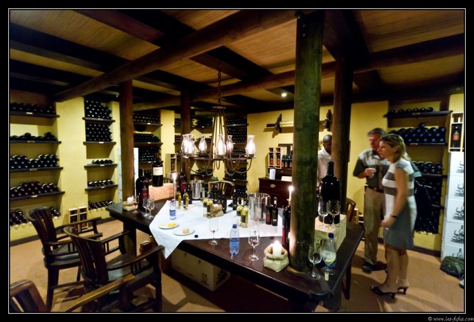 Le lodge possède une cave à vin enterrée dans le sol. Nous rejoignons les autres touristes (15-20 personnes) et on nous fait gouter plusieurs vins sud-africains (il n’y en a quasiment aucun en Namibie). Ces bouteilles sont bien sur disponibles à l’achat pour agrémenter le repas,