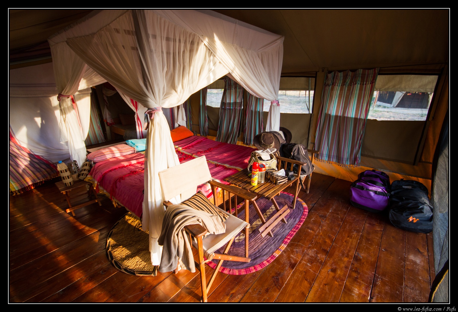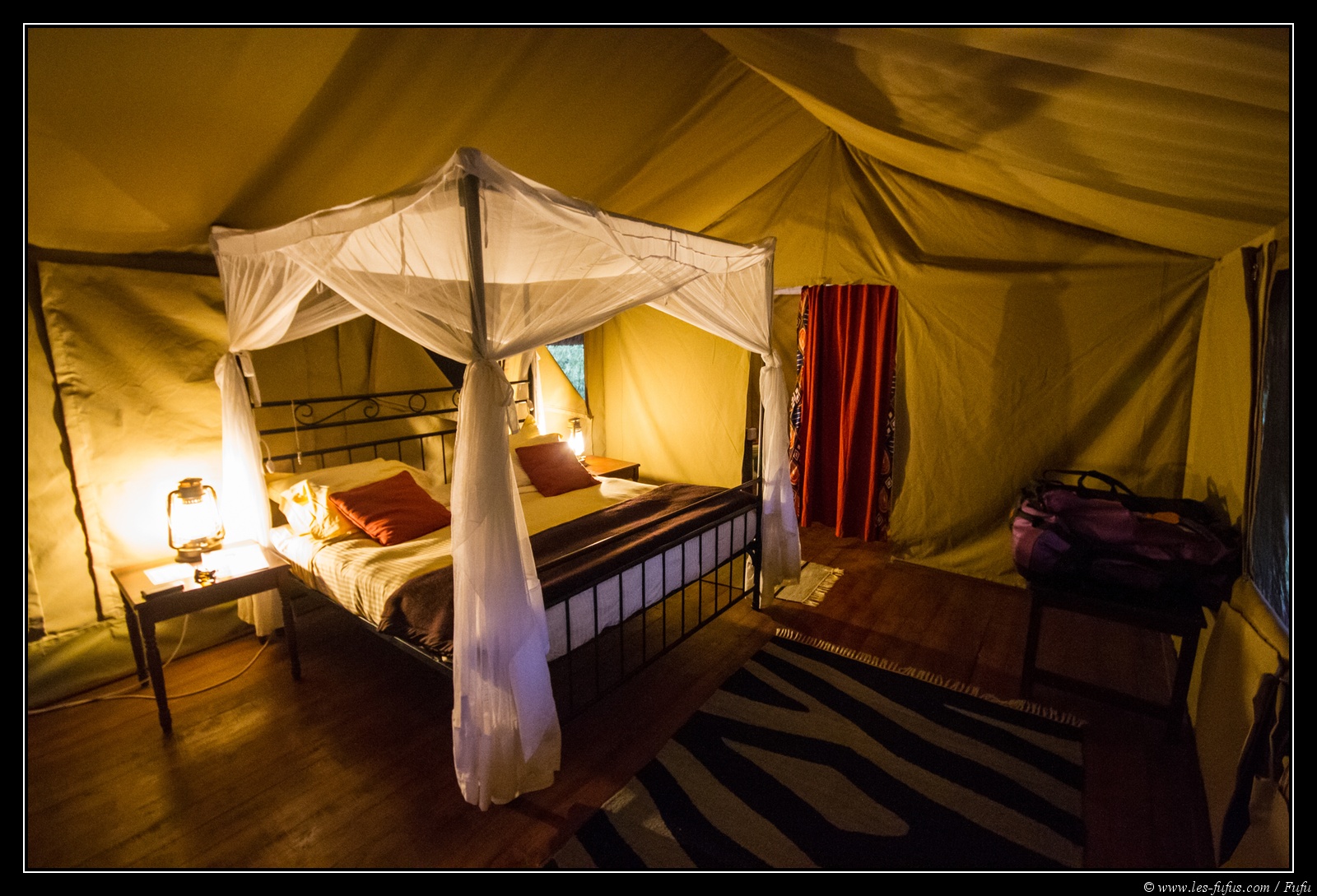 De retour au camp et après un bon repas, on se couchera tôt et notre nuit se déroulera sans problèmes. Je serai quand même réveillé par quelques hyènes venant renifler les abords de notre tente. Pffff, on ne peut pas dormir tranquille en savanne !
