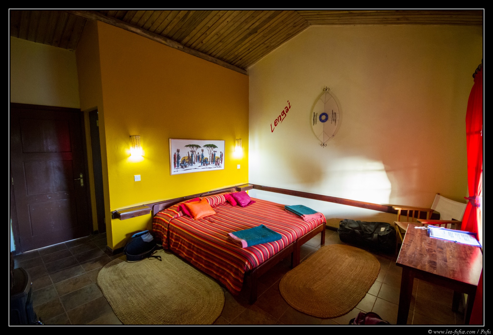 On ressort par une entrée opposé et nous revenons par les crêtes. Amys nous conduit à notre lodge du soir, le rhino lodge. Ce dernier est tenu par un français. Il est très bien, mais ne se trouve pas sur le bord du cratère (mais vu qu’il est déjà tard quand on arrive, ce n’est pas grave). Les chambres sont impeccables, il y a beaucoup de pression d’eau. On est ravi. Par contre, et bien que nous soyons pendant la période la plus chaude de l’année, il fait très frais, au point que nous demanderons d’allumer le poêle de notre chambre pour la nuit. C’est un bon lodge à recommander.