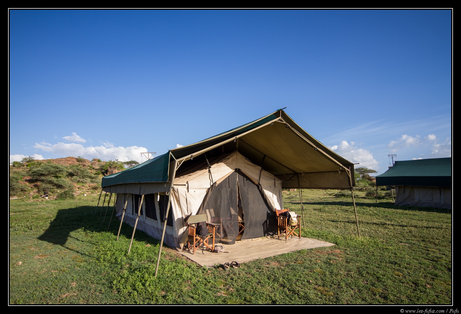 En fin de soirée, nous quittons le parc à proprement dit pour rejoindre le NCA et un endroit isolé où Corto Safari a implanté son camp. L’endroit est idyllique. On est sur une hauteur, avec un magnifique paysage. Des girafes broutent à quelques centaines de mètres. C’est un endroit de rêve que nous ne partageons encore une fois avec personne, nous sommes les seuls clients. Le seul reproche que l’on pourrait trouver est que le site est trop éloigné de la zone des Game Drive. Il faut plus une heure trente pour s’y rendre (même si en chemin, il y a déjà de très nombreux animaux).