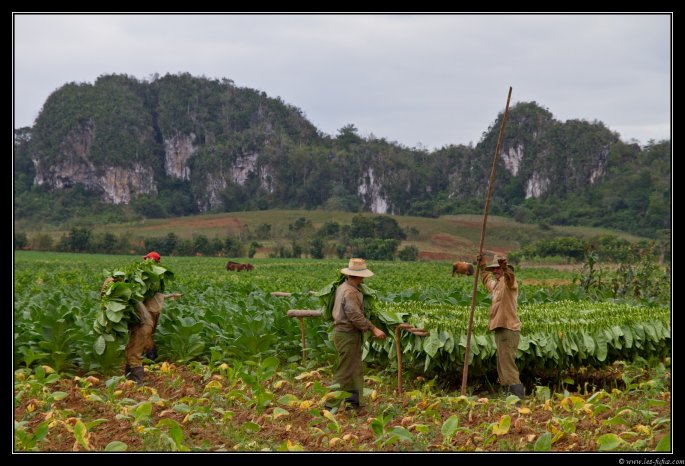 On se promènera comme ça pendant des heures, s’arrêtant ici ou là pour aller voir les agriculteurs. La plupart d’entre eux récoltent aux couteaux les feuilles de tabac … un cigare à la bouche.