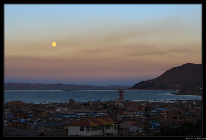 Nous arrivons vers 14h00 à Puno (3827m). Nous apercevons pour la première fois le lac Titicaca. C’est beau, c’est grand … et ce n’est que la baie de Puno pour le moment.