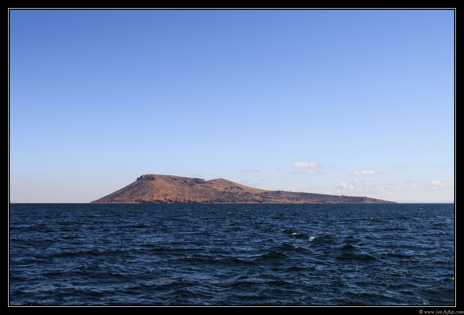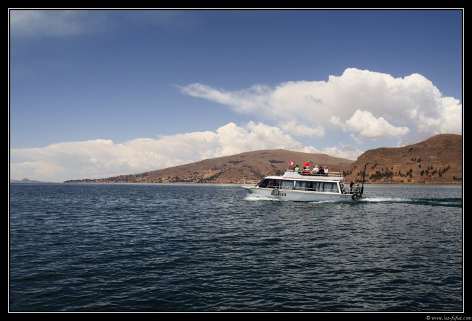 Sur le bateau, vous avez le choix, soit à l’intérieur avec ses grandes baies, au milieu du bruit du moteur et des odeurs d’essence, soit l’extérieur dans le vent glacial (on est à prés de 4000 m tout de même) et sous un soleil de plomb (prévoir une bonne crème solaire). Mais la vue du lac est fantastique. On dirait une vraie mer. Sur certains cotés, on ne voit pas la côte ni même les montagnes au loin … comme sur l’océan.