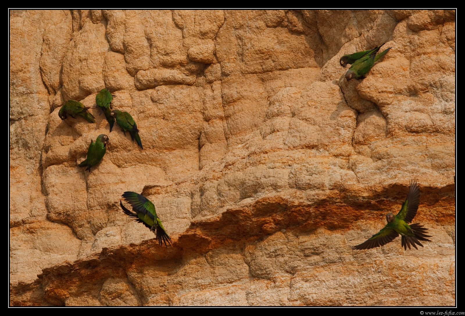 Nous pouvons alors admirer les perroquets qui viennent par groupe de 10-20 individus s’alimenter sur les parois. Le silence de la part des participants est requis pour ne pas effrayer les oiseaux ….. et je me suis chargé d’assurer ce silence : on n’entendra pas une seule fois les personnes qui nous accompagnent
