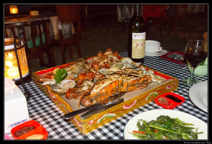 Nous remontons en voiture et notre guide nous emmène sur la plage de Jimbaran pour notre diner du soir. Tout le littoral est occupé par les restaurants, ce n’est pas le choix qui manque. Le principe est simple : vous choisissez votre nourriture (poissons, langouste, etc…), on vous les prépare et on vous sert sur la plage. On ira donc dans l’un de ces établissements, et on se fera plaisir. C’était bon, mais très cher en contrepartie (quasiment autant qu’en France), et qui plus est, les prix ne sont pas très compréhensibles (c’est au poids … mais qui sait vraiment ce que pèse une langouste). Donc à faire, si on ne regarde pas trop son porte-monnaie, sinon je suis sur qu’on doit trouver un meilleur rapport qualité prix ailleurs.
