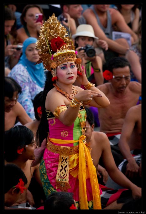 Le soleil commence à se coucher et nous prenons place dans le petit théâtre du temple. Tous les jours a lieu le spectacle « La Danse des Singes – Kechack ». Ce spectacle est fait pour les touristes – ne nous leurrons pas – mais reste assez authentique à mon sens. J’ai d’ailleurs été surpris tout au long de notre voyage concernant les danses balinaises. Je pensais que c’était juste des danses alors qu’en fait, ce sont de petites pièces de théâtre.