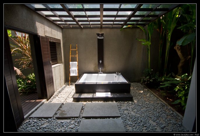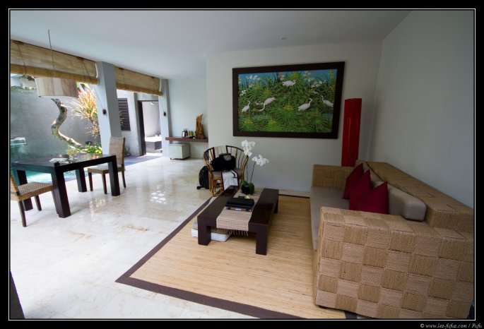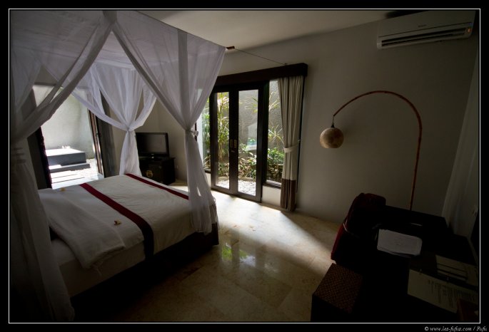 Nous avons une petite suite dans le Annora Bali Villas (http://annorabali.com). Alors plantons le décor. La chambre est constituée d’une vaste chambre à coucher avec un lit gigantesque, une salle de bain à toit ouvert avec une énorme baignoire où l’on peut tenir à 3-4. Nous avons aussi un vaste salon ouvert sur l’extérieur et surtout une piscine privative. L’ensemble est entouré de hauts murs, assurant en toute circonstance une intimité parfaite.