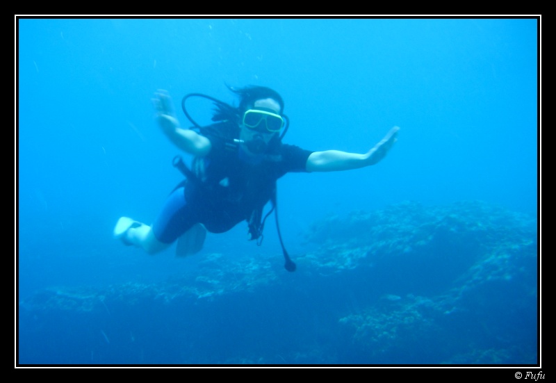 Je prends avec moi un petit APN, avec un sac étanche pour immortaliser le moment. Elle n’est pas mignonne cette apprenti-plongeuse ???