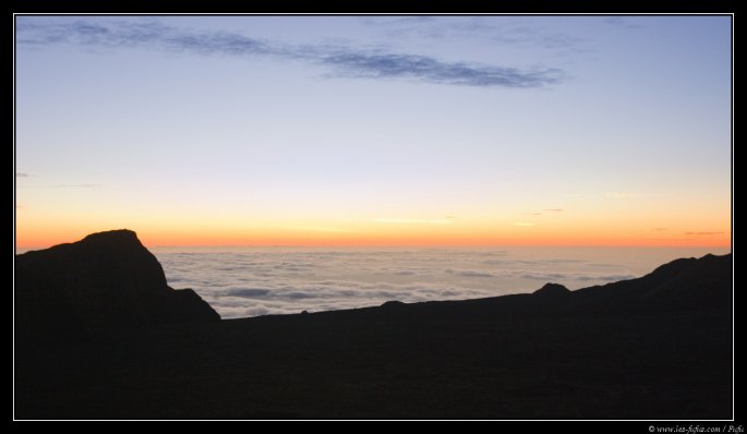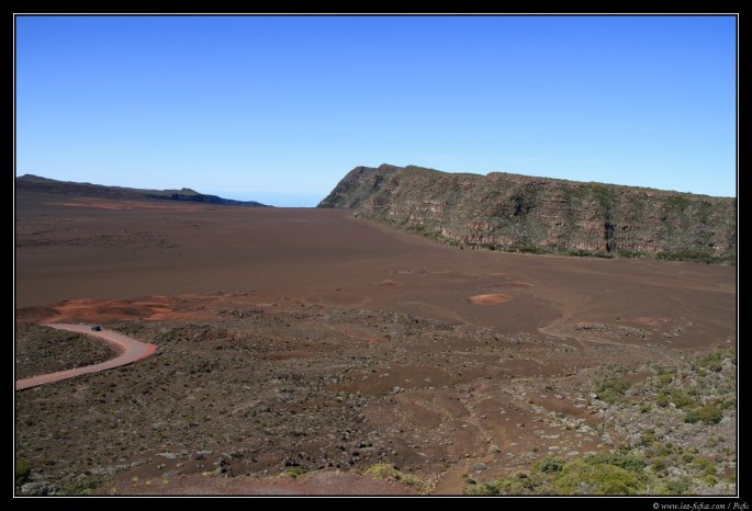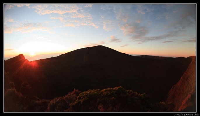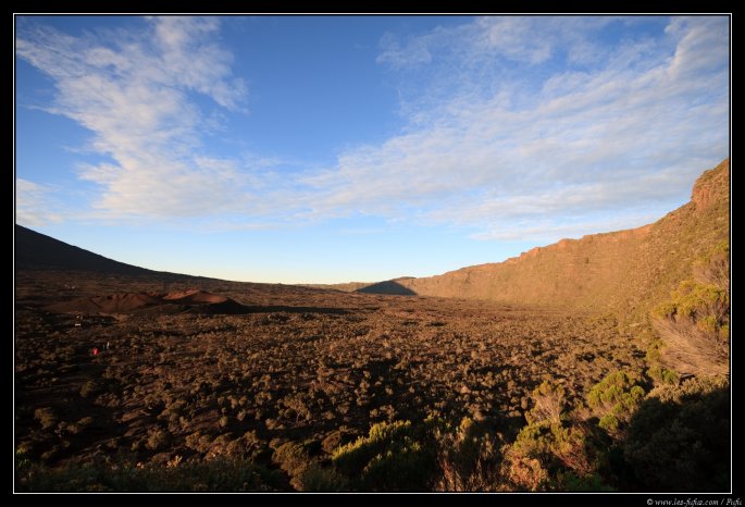 Il n’y a personne sur la route et nous approchons de l’arrivée au environ de 6h00, les derniers kilomètre se faisant au ralenti car la route n’est pas goudronné. On se gare à coté du belvédère du Pas de Bellecombe, au bord de l’enclos. Le timing est parfait : 5 minutes plus tard, le soleil se lève sur l’enclos et le volcan
