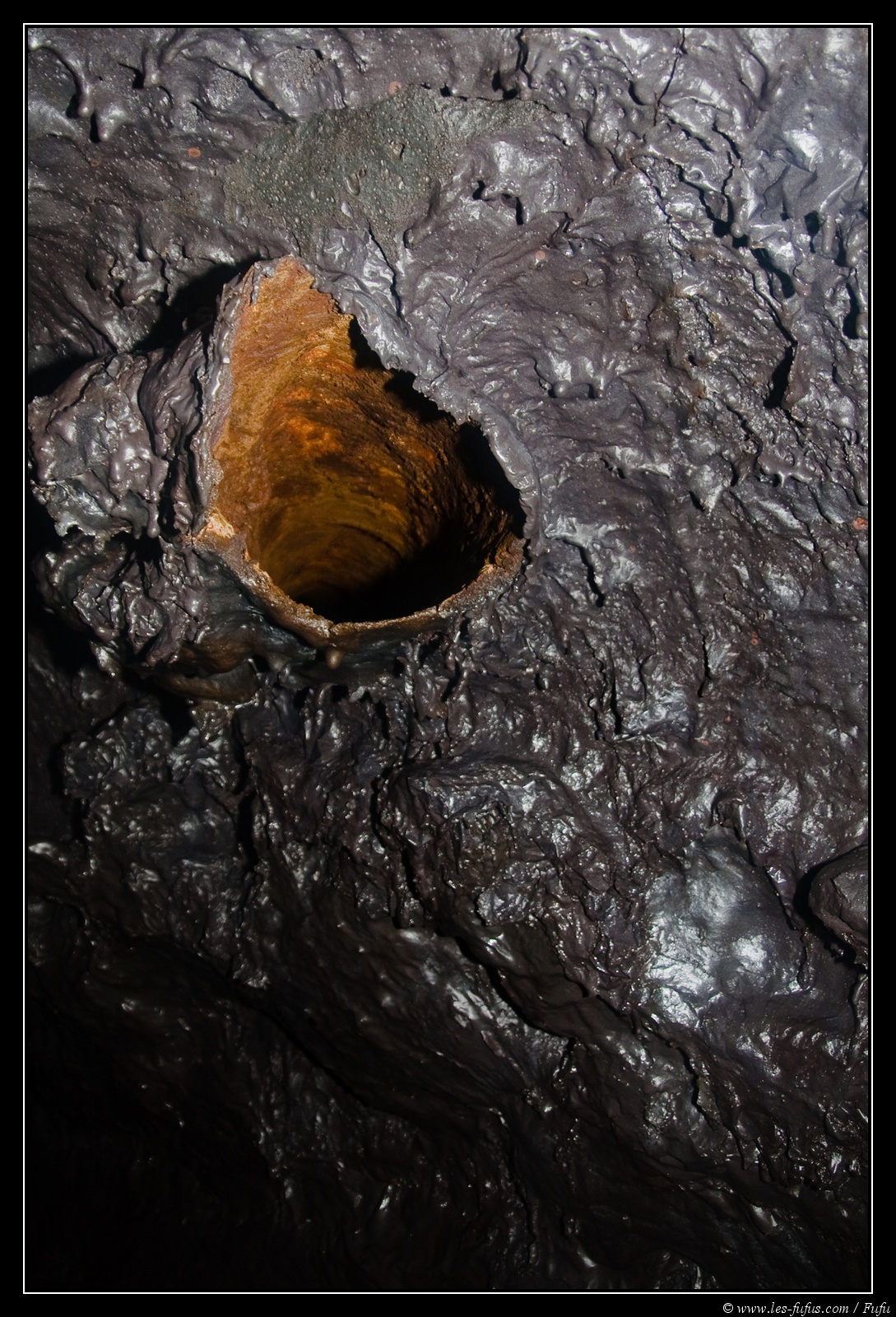 Un trou laissé par un arbre qui s’est consumé lentement pendant que la lave l’ensevelissait.