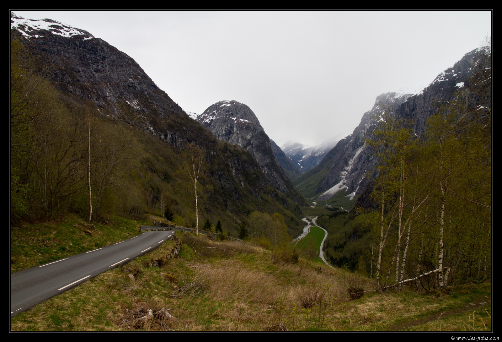 Je suis désormais sur l’E16 qui longe le Nefjorden. Il fait beau et le thermomètre s’affole en affichant 12°C !! Ca change de ses derniers jours.