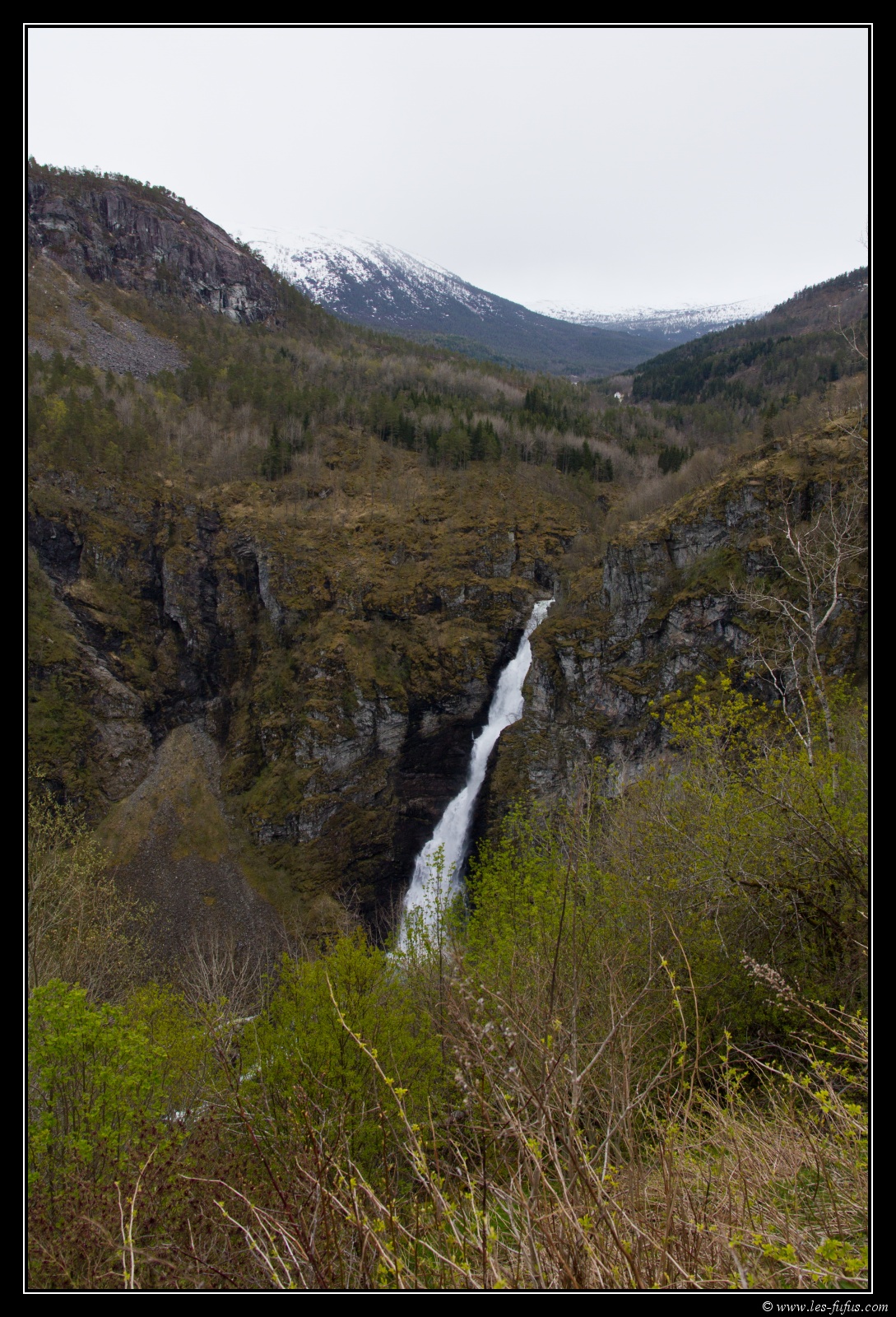 Par la suite la route s’enfonce dans les terres et les lacs se succèdent. La route comprend beaucoup de tunnel. A Voss, je pars pour le nord (toujours sur l’E16) et passe devant la cascade de Tvindefossen.