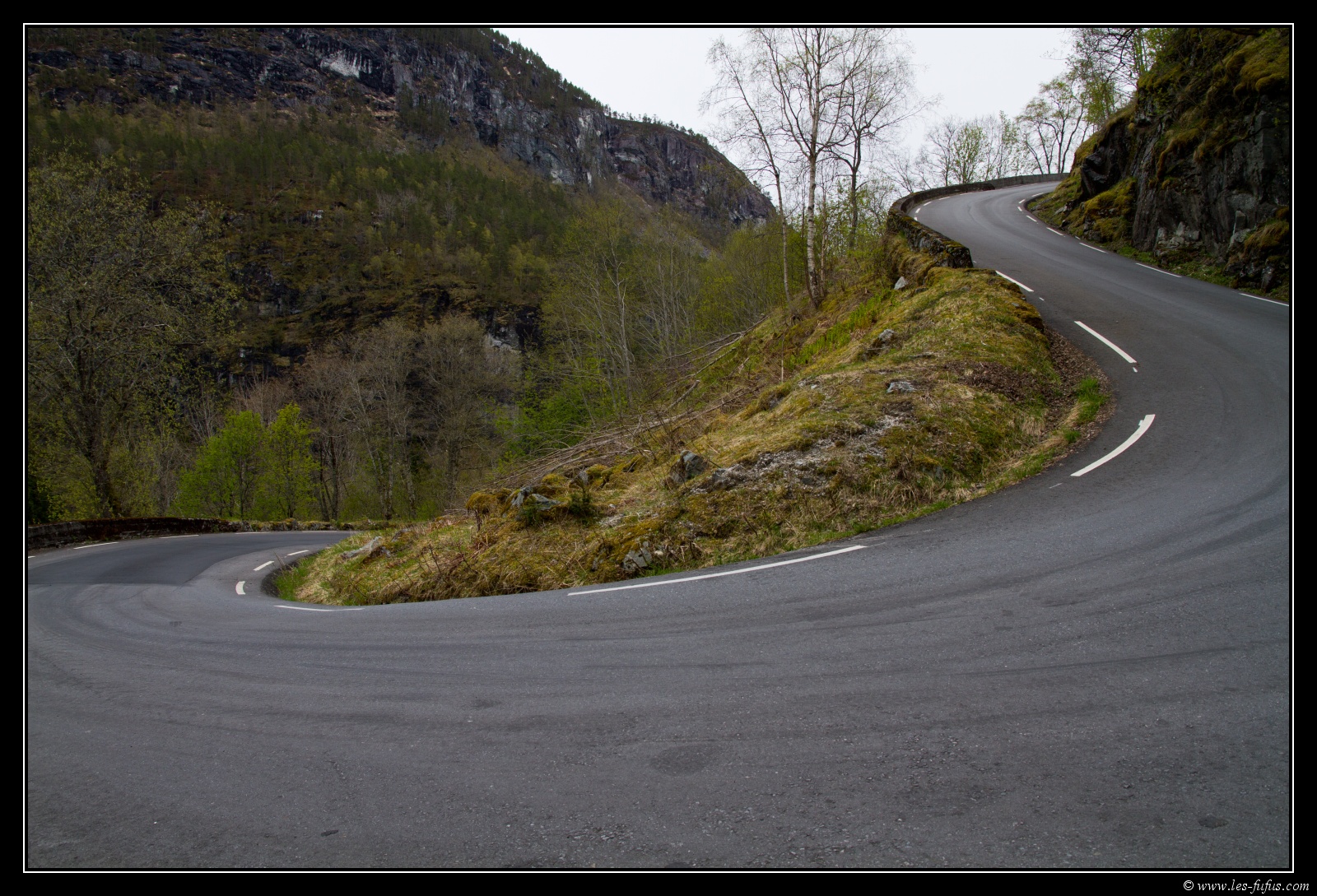 La route est désormais à sens unique afin de faciliter la descente. Juste après le point de vue sur la vallée de Nærøydalen, la route descend en épingle avec un dénivelé de plus de 18% !