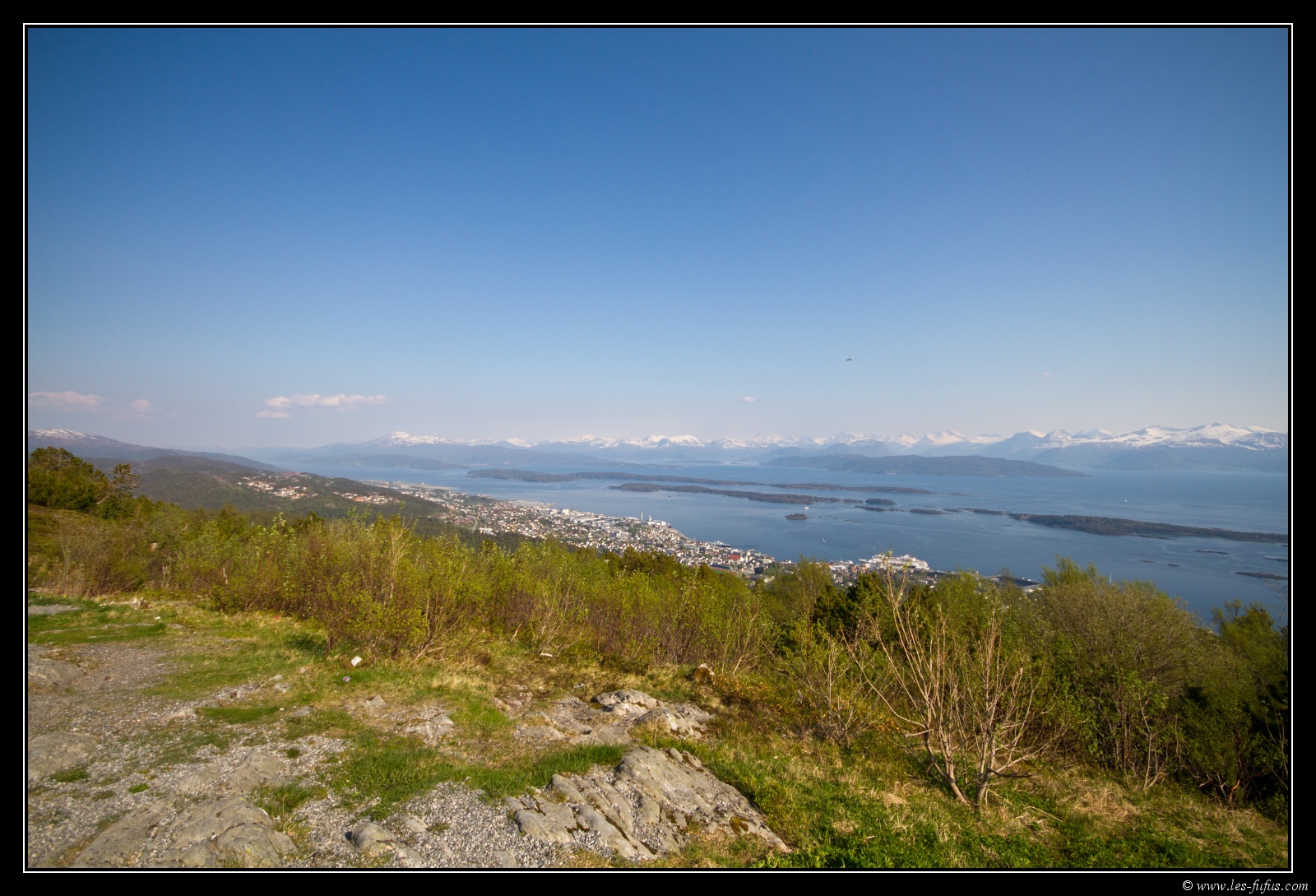 Arrivé en ville, je me dirige de suite vers le point le plus élevé et son panorama. Au bout de 9 km (dont 3 en terre recouvert de 2 cm de graviers – faudra d’ailleurs m’expliquer pourquoi il laisse toujours un morceau de route pas fini en Norvège