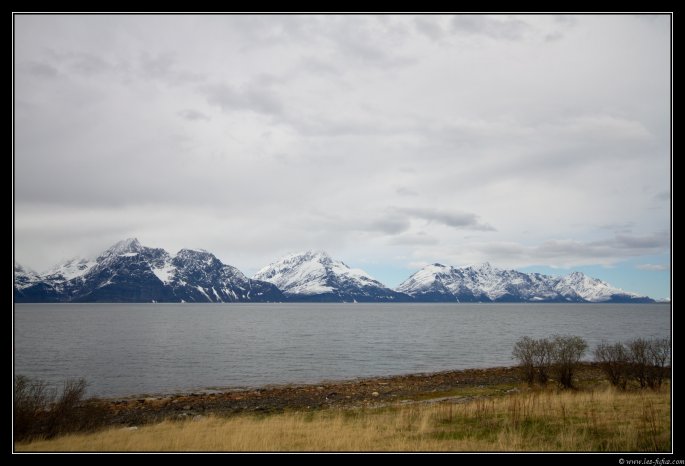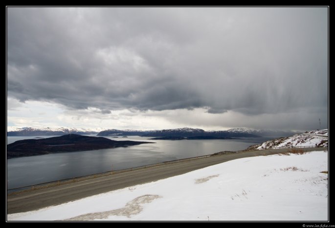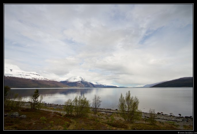 J’essuie ma première averse de la journée dans le petit fjord Kåfjorden. Mais je sèche rapidement. La route E6 déroule rapidement son ruban sous mes roues. Désormais, la neige est présente régulièrement et il commence même à y avoir des congères au niveau des fjords. Je quitte l’Oksfjorden et monte dans une montagne