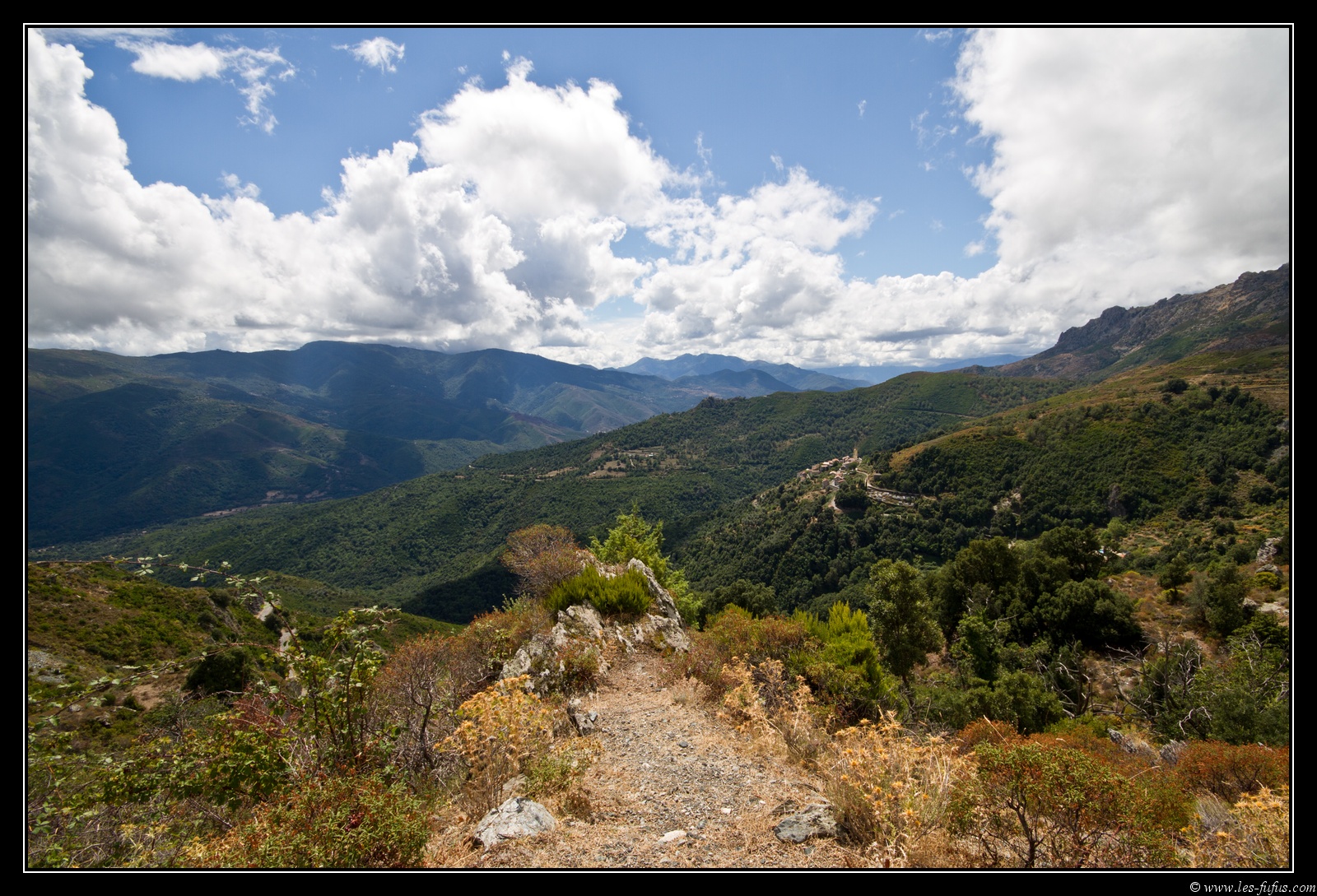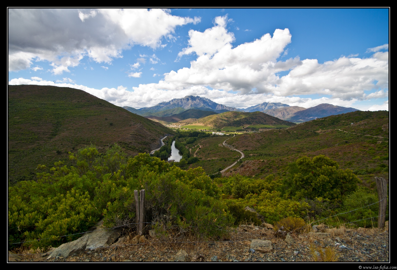 Nous reprenons la route et quelques kilomètres avant le village de Ponte Leccia, nous bifurquons sur une route secondaire qui nous emmène sur les hauteurs. Par moment le macadam est nickel, d’autrefois, ce n’est qu’un vaste champ de nid de poule. Une seule constante : la route n’est guère plus large qu’une piste cyclable et les bords donnent sur d’impressionnants précipices. Heureusement, la route est peu utilisée et on ne croisera quasiment aucune voiture. On passera par quelques villages typiquement corses, accrochés à flanc de montagne.
