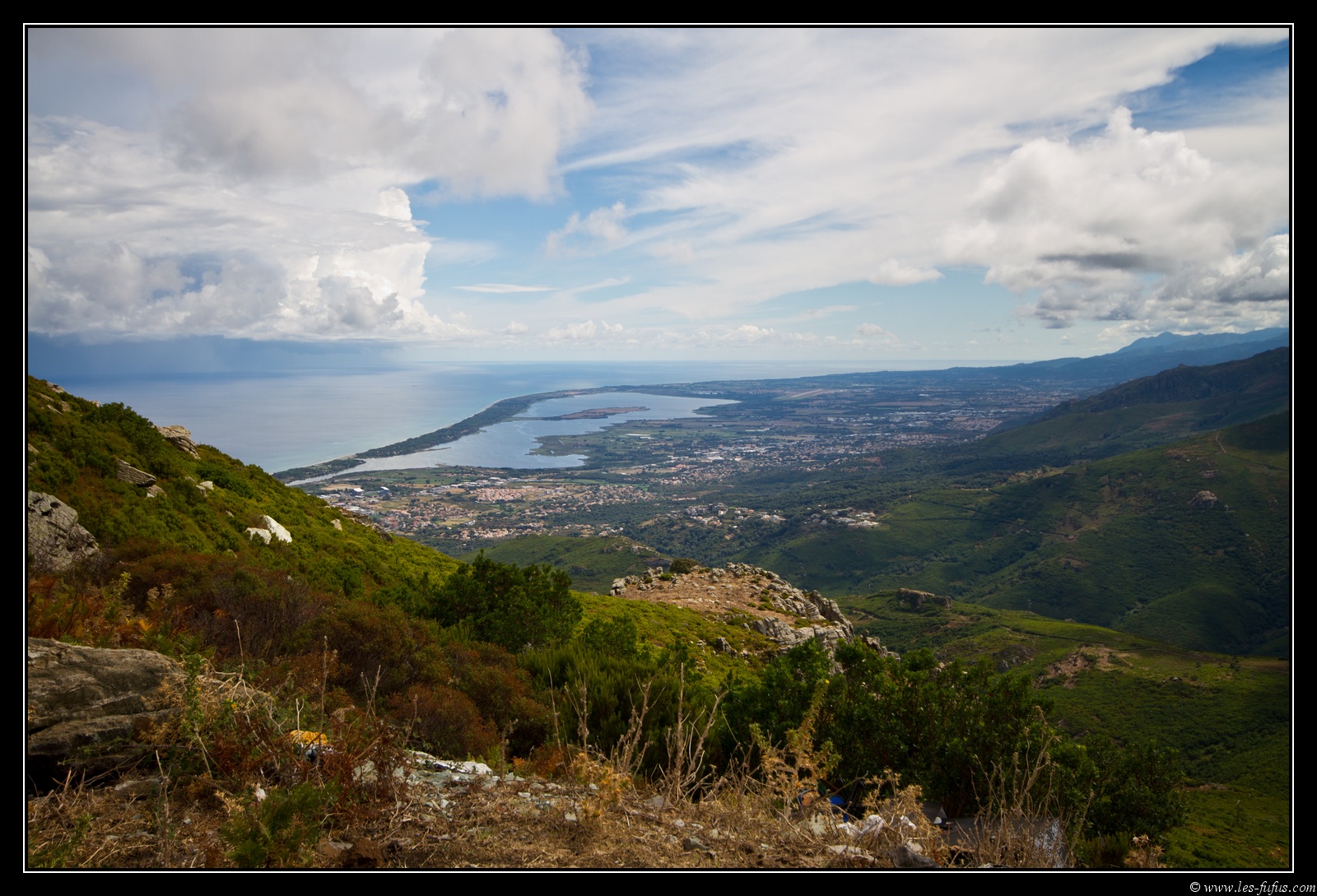 Nous poursuivons la route de montagne et rejoignons le col de Teghime. Tout de suite, j’embraye pour la route accédant à la station météo de Serra di Pigno, Le premier kilomètre est pourri, mais ensuite la petite route est un billard, simplement accolée aux précipices. On s’arrêtera un peu avant le haut de la montagne, les nuages étant trop bas. N’empêche, quelle vue !!!