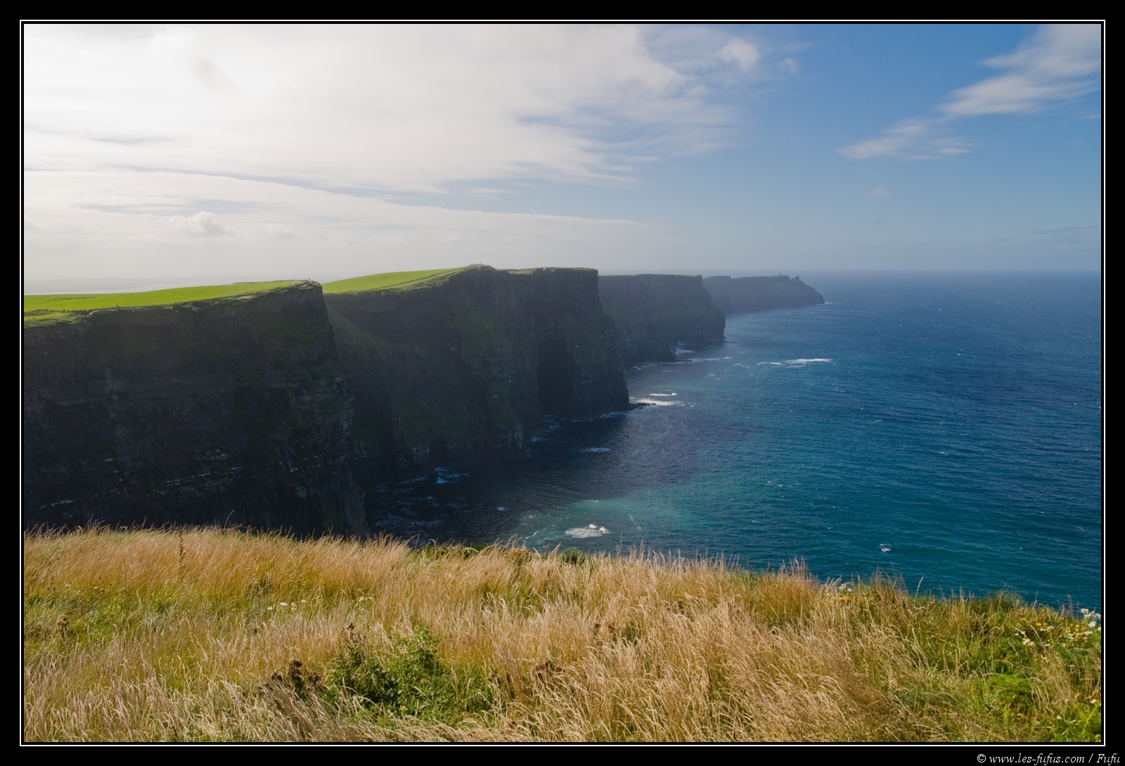 Les falaises s’élèvent jusqu’à 214 m au-dessus de l’océan Atlantique sur une longueur de 8 km.