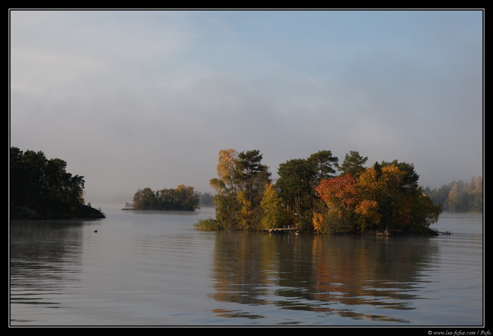 On se rend au city hall où partent différents ferries, dont notamment celui allant au Palais Drottningholm (lien Wikipédia). On embarque à 10h00. Le trajet prend environ 1h-1h15, et permet d'apprécier l'archipel de Stockholm. En plus la brume est encore bien présente sur certaines zones, donnant une atmosphère particulière aux lieux.